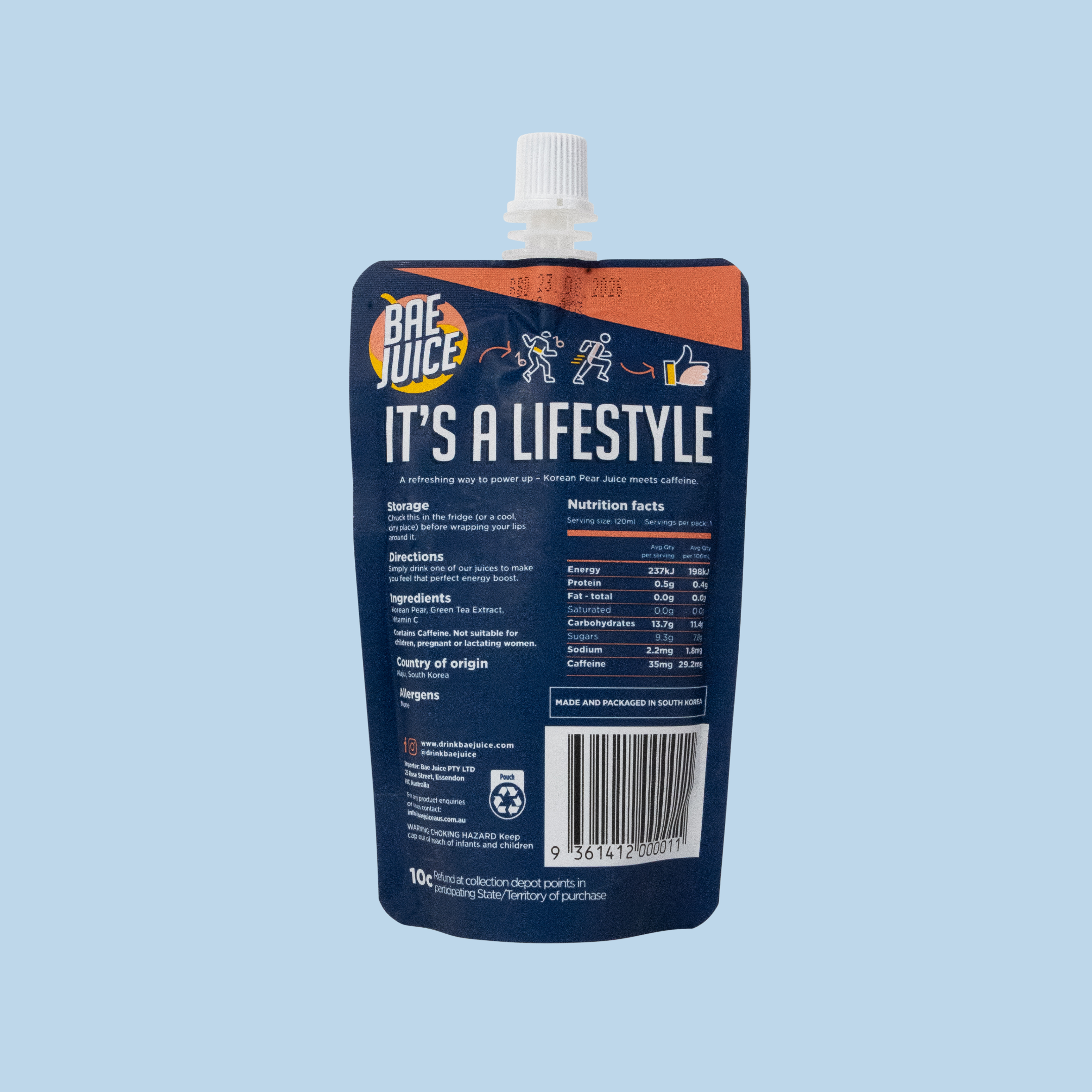 Bae Energy - A refreshing way to power up, Korean Pear Juice meets caffeine. Bae Juice Energy brings you nothing but the good stuff, high quality Korean pear juice with no added sugars is now infused with green tea extract for a natural lift - stay sharp, stay fresh and keep the good vibes going.